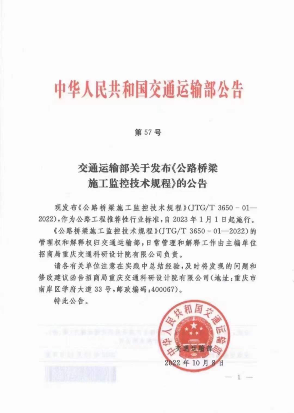 10月8日,由招商交科主持編寫,招商路檢具體實(shí)施的公路工程行業(yè)標(biāo)準(zhǔn)《公路橋梁施工監(jiān)控技術(shù)規(guī)程》(JTG/T 3650-01-2022)正式發(fā)布。 為提高橋梁施工質(zhì)量,保證橋梁結(jié)構(gòu)安全,交通