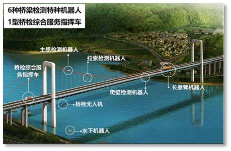 研制水、陸、空立體協(xié)同的大跨度橋梁檢測與評估裝備體系,形成全地域全橋型的檢測能力,實現(xiàn)橋梁表面、纜索、水下結(jié)構(gòu)等關鍵部位的高效初檢、全面詳檢、數(shù)據(jù)分析、損傷評估等一體化服務,極大提高大跨度橋梁定檢、特