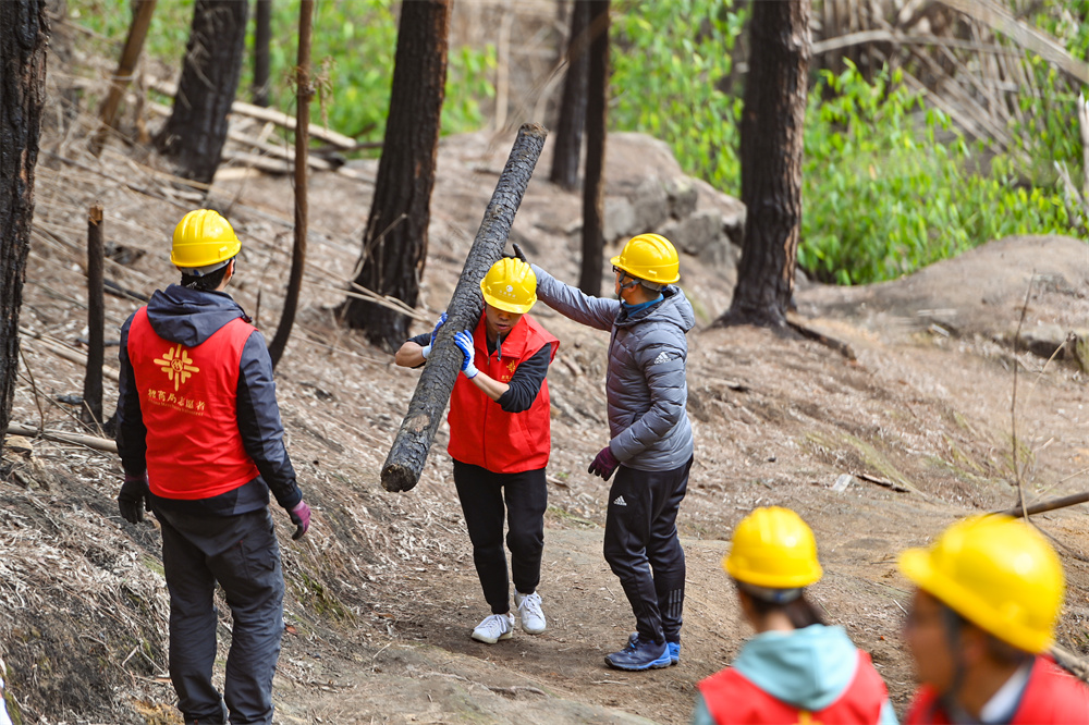 一群平日里拿“筆桿子”的科研工作者,滿懷公益熱忱,此刻化身招商局志愿者,一路向前,從鄉(xiāng)村道路到崎嶇山路再到陡峭山壁,從山下住戶到山火第一條隔離帶再到山火核心地帶,經(jīng)過一個多小時徒步前行,最終抵達待修繕路段,眼前的一幕幕景象深深震撼著每一位志愿者,隨處可見的殘根斷枝,焦黑色的痕跡猙獰可怖。望著這片受傷的山林,志愿者們心中的信念更加堅定了。