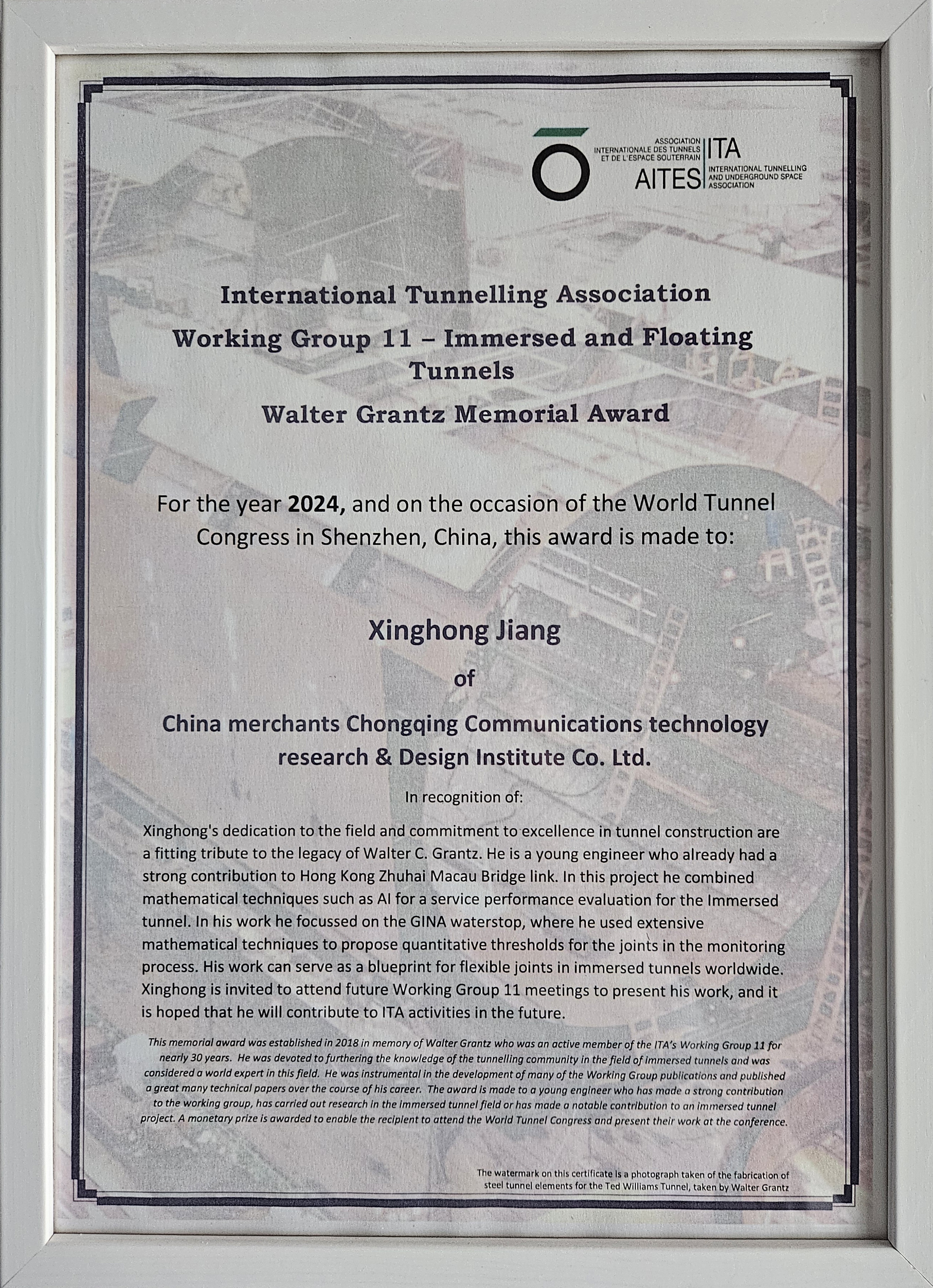 Walter Grantz紀(jì)念獎由國際隧協(xié)沉管與懸浮隧道工作組國家代表提名、工作組評定,每年進(jìn)行一次,用于表彰在沉管或懸浮隧道領(lǐng)域做出重要貢獻(xiàn)的青年工程師。江星宏及所在團(tuán)隊——隧道研究院在沉管隧道體系、指標(biāo)與標(biāo)準(zhǔn)方面,構(gòu)建了沉管隧道綜合服役性能評定體系,建立了接頭局部向整體推演的數(shù)理模型,提出了沉管隧道接頭量化評定指標(biāo)與標(biāo)準(zhǔn),為沉管隧道的服役安全提供了堅實的保障。
