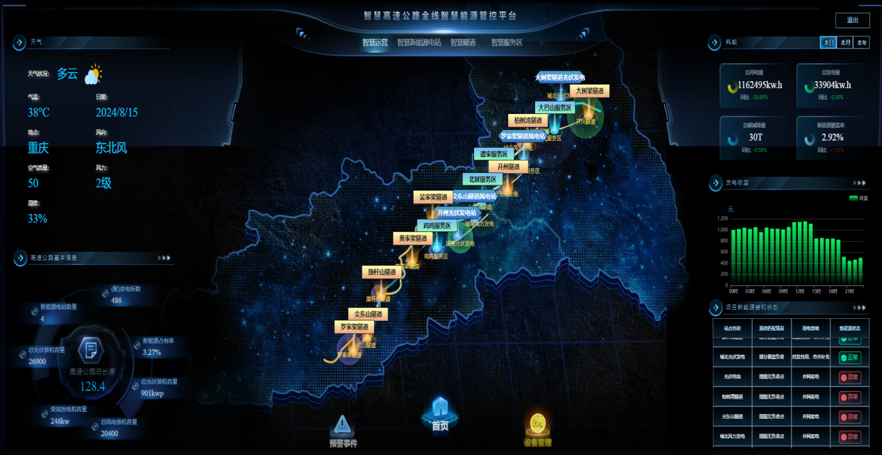 智慧能源管控平臺(tái)集高速公路全線供電側(cè)與負(fù)載側(cè)于一體,結(jié)合發(fā)電預(yù)測(cè)、用能預(yù)測(cè)、可靠性冗余、用能匹配及節(jié)能決策等智能算法,實(shí)時(shí)分析高速公路沿線綠色能源出力與用能,形成綠色能源不確定性出力與沿線負(fù)載動(dòng)態(tài)用能的匹配決策,實(shí)現(xiàn)高速公路全線能源的智能化管理與優(yōu)化目標(biāo),助力高速公路全線精準(zhǔn)降碳、降本增效。