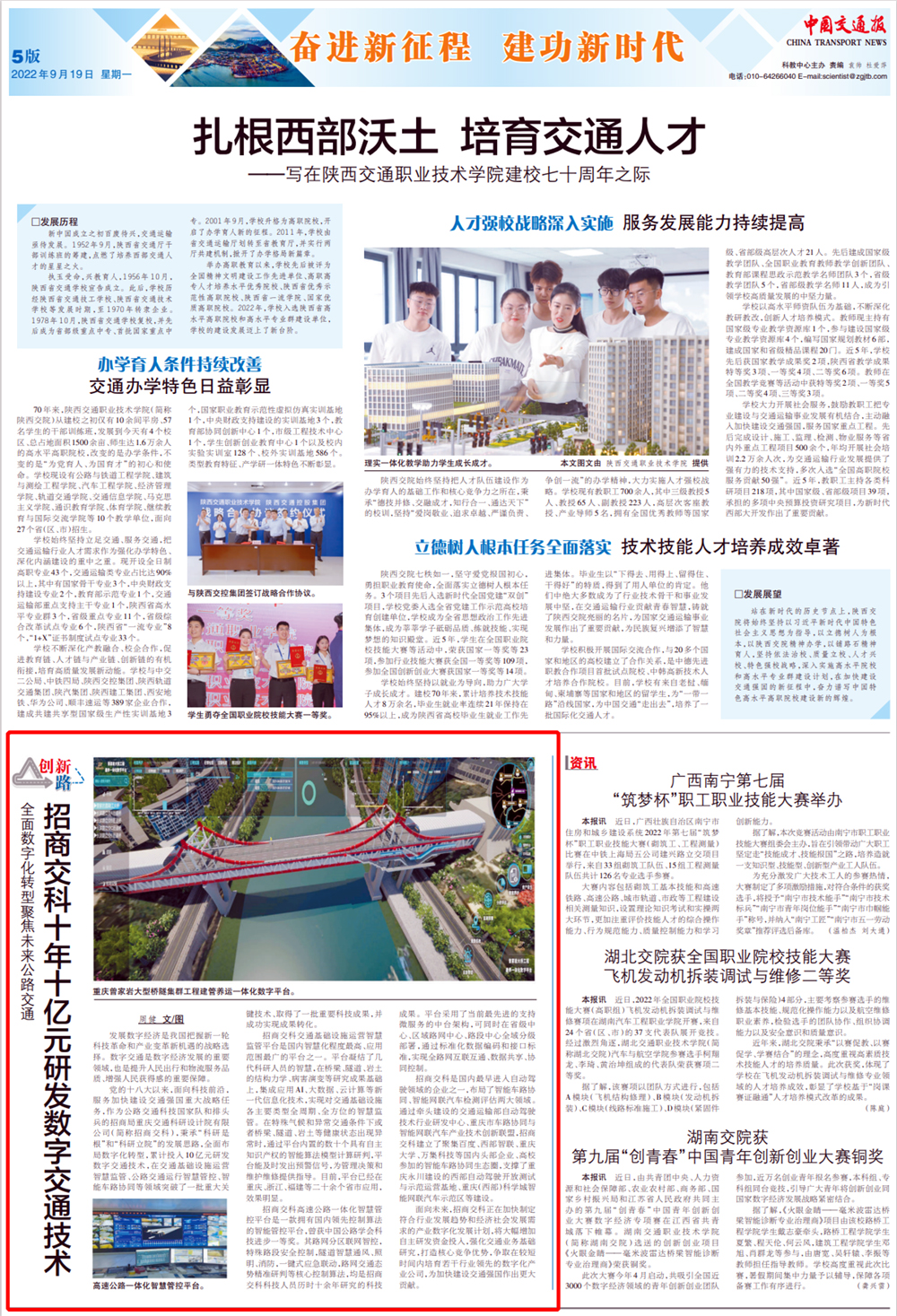 【編者按】2022年9月19日,《中國交通報》在第五版全文刊發(fā)了數(shù)字化中心文章《全面數(shù)字化轉(zhuǎn)型聚焦未來公路交通——招商交科十年十億元研發(fā)數(shù)字交通技術(shù)》。文章梳理了黨的十八大以來,公司在數(shù)字交通領(lǐng)域取得的系列成就,同時聚焦未來交通,公司將積極主動的把握機遇,努力打造核心優(yōu)勢,服務(wù)交通強國重大戰(zhàn)略任務(wù)?,F(xiàn)將全文轉(zhuǎn)載如下: