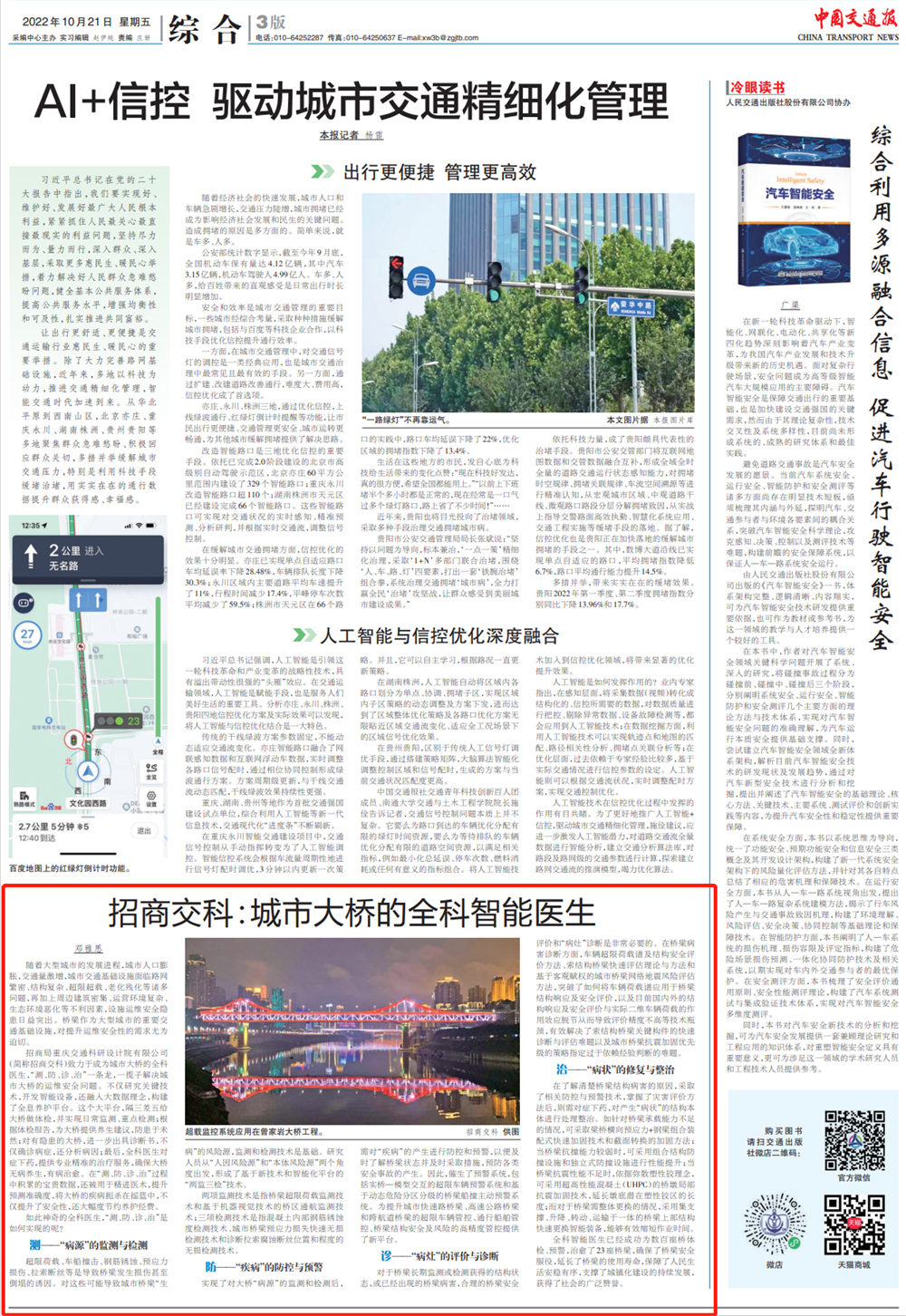 2022年10月21日,《中國(guó)交通報(bào)》在第三版以《招商交科:城市大橋的全科職能醫(yī)生》為題,全文刊發(fā)橋梁研究院文章,展現(xiàn)招商交科通過(guò)開發(fā)智能設(shè)備,融入大數(shù)據(jù)理念,構(gòu)建全息養(yǎng)護(hù)平臺(tái)等多種方式,解決城市大橋的運(yùn)維安全問題,為建設(shè)交通強(qiáng)國(guó)、數(shù)字中國(guó)貢獻(xiàn)交科方案。
