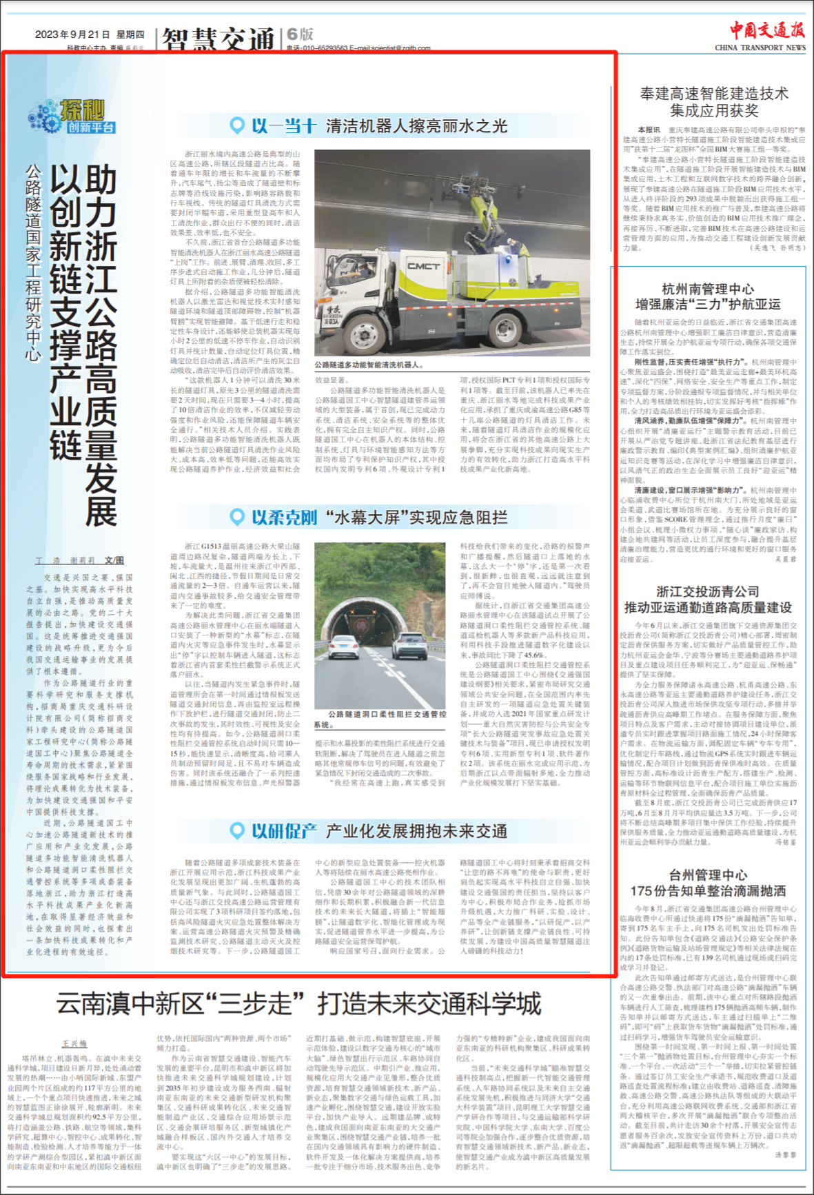 2023年9月21日,《中國交通報》在第6版以《創(chuàng)新鏈支撐產(chǎn)業(yè)鏈發(fā)展 公路隧道國家工程研究中心助力浙江打造高水平科技成果產(chǎn)業(yè)孵化新高地》為題,刊發(fā)了招商交科公路隧道國家工程研究中心有關(guān)報道。報道聚焦長大公路隧道成套技術(shù)裝備的示范應(yīng)用,介紹招商交科“公路隧道多功能智能清洗機(jī)器人”“公路隧道洞口柔性阻攔交通管控系統(tǒng)”等裝備落地浙江,并與浙江地方企業(yè)展開科研項(xiàng)目合作,助力浙江打造高水平科技成果產(chǎn)業(yè)化新高地,加速我國公路隧道新技術(shù)的推廣應(yīng)用和產(chǎn)業(yè)化發(fā)展的具體情況?,F(xiàn)將全文轉(zhuǎn)載如下: