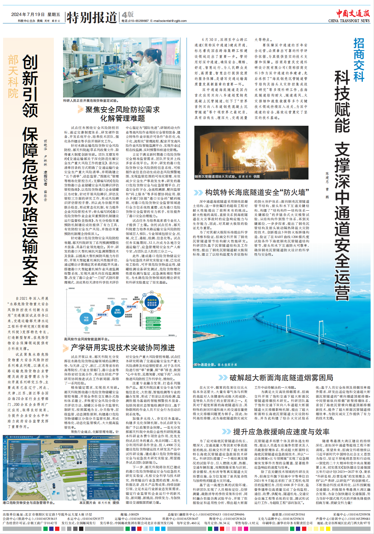 7月19日,《中國交通報(bào)》在第四版“特別報(bào)道”刊發(fā)了《招商交科:科技賦能 支撐深中通道安全運(yùn)營》文章,介紹了招商交科作為深中通道的參建單位之一,在海底隧道結(jié)構(gòu)耐火、隧道通風(fēng)、火災(zāi)排煙和疏散救援等技術(shù)攻關(guān)方面作出的貢獻(xiàn)?,F(xiàn)將全文轉(zhuǎn)載如下: