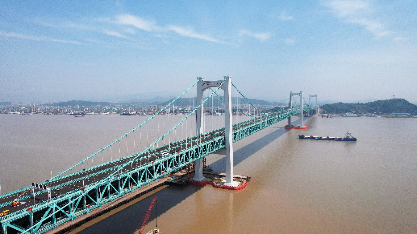 甌江北口大橋是世界上首座三塔四跨雙層鋼桁梁懸索橋,上層高速公路采用雙向六車道高速公路標(biāo)準(zhǔn);下層南金公路采用雙向六車道一級(jí)公路標(biāo)準(zhǔn)。鋼橋面鋪裝方案采用3.5cm澆注式GA10+3.5cm高彈改性瀝青SMA10,鋪裝面積為66791㎡。